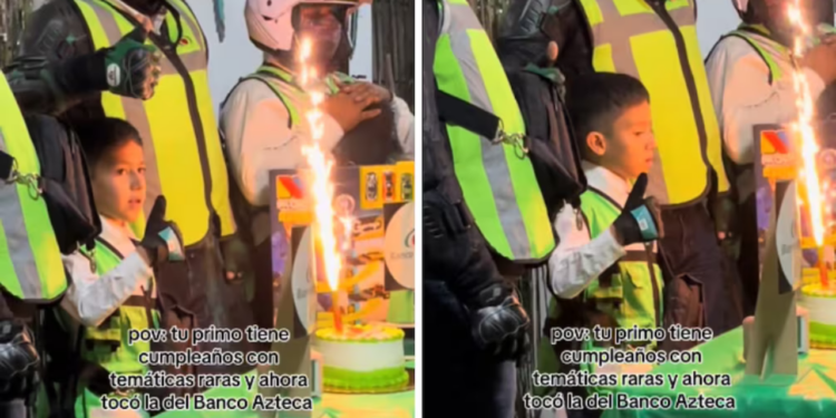 Un niño, lejos de optar por los típicos personajes de caricaturas o superhéroes, eligió celebrar su cumpleaños inspirado en el mundo de Banco Azteca, logrando una decoración y vestimenta que simulan la apariencia de los cobradores de la institución financiera.